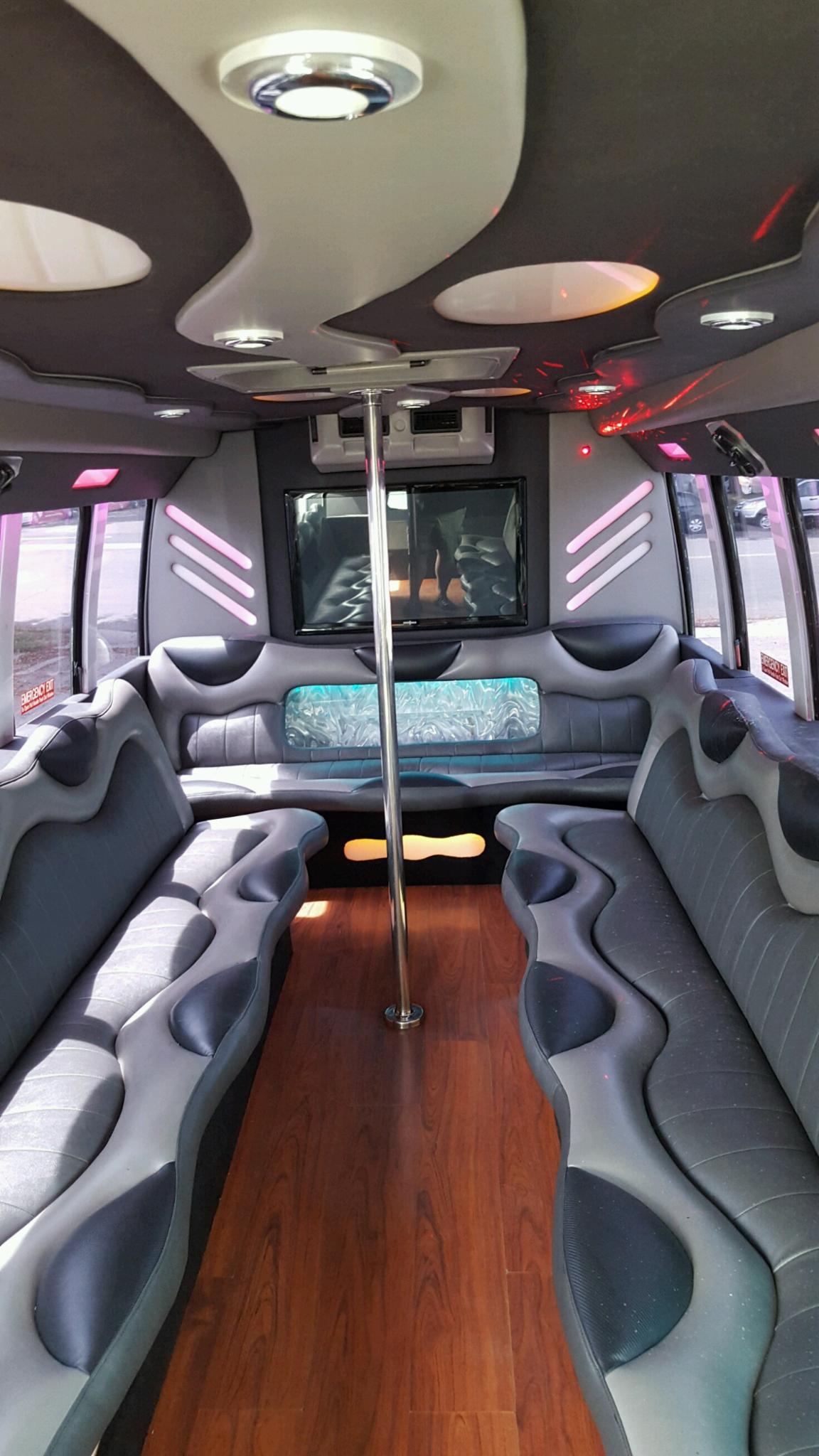 Our latest addition to the fleet is a ride very similar to our original Big Sexy. Sleek black limo bus (new paint!) with an awesome interior with modern leather seating, pocket bars, and cool lighting features.